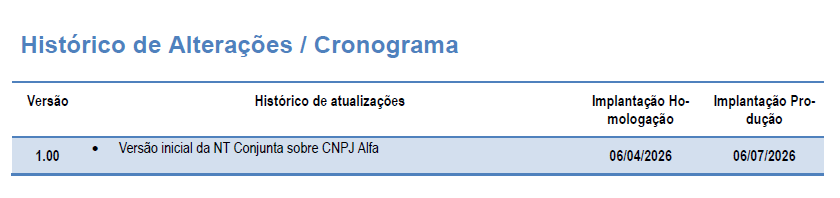 O inicio em produção é em: 06/07/2026. - A expressão regular que valida um campo do tipo CNPJ passa a aceitar letras maiúsculas nas primeiras 12 posições: [A-Z0-9]{12}[0-9]{2}