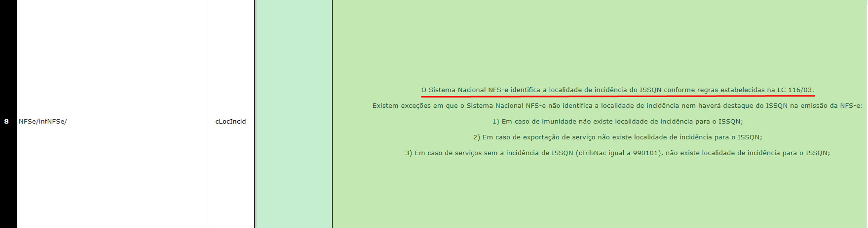 Outro ponto é que nos dados de Envio da DPS não existe um campo que defina qual seria o município de incidência e validando as regras do Nacional essa informação é definida pela LC 116 possivelmente vinculada ao código de serviço usado nas emissões (ao que foi interpretado por nós) conforme descritivo abaixo: