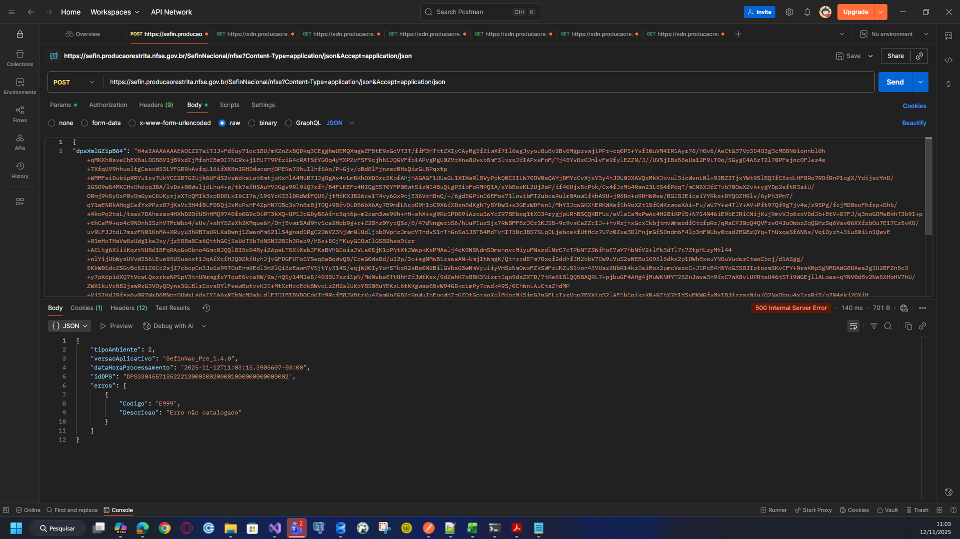 Ao invés de gerar o erro de validação E0314, ocorreu Internal Server Error HTTP 500, código de Erro E999 e fica sem direcionamento do que pesquisar.