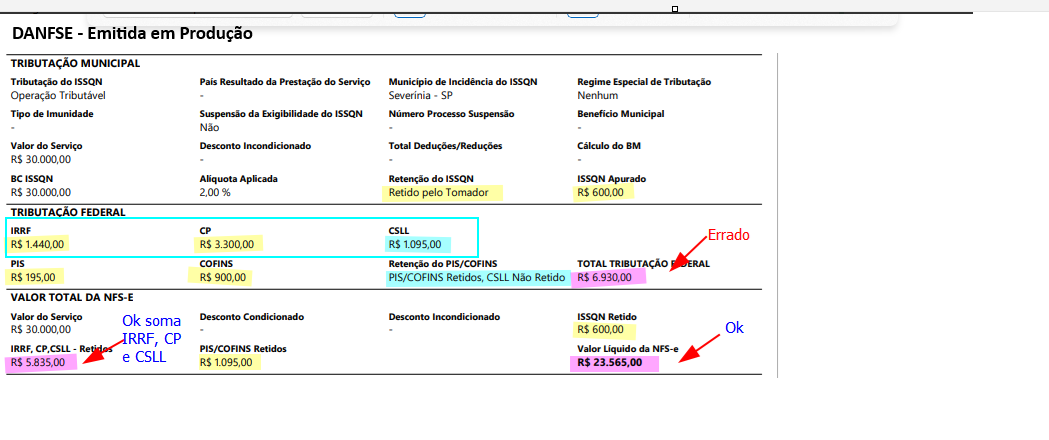 Veja o Total de Tributação Federal, apresenta o valor duplicado do Pis e Cofins, o correto seria: R$ 5.835,00, porém no DANFSe está: R$ 6.930,00 = produto da soma Pis + Cofins + valor constante do CSLL (passou a entrar no Pis e Cofins pela instrução da NT_007…)