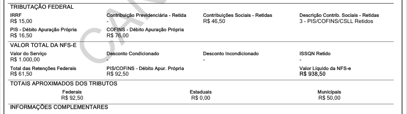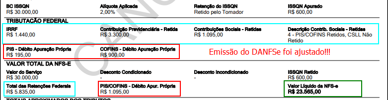 Consequentemente o valor do PIS/COFINS e CSLL retido ficarão no mesmo campo “Contribuições Sociais - Retidas” no DANFSE.