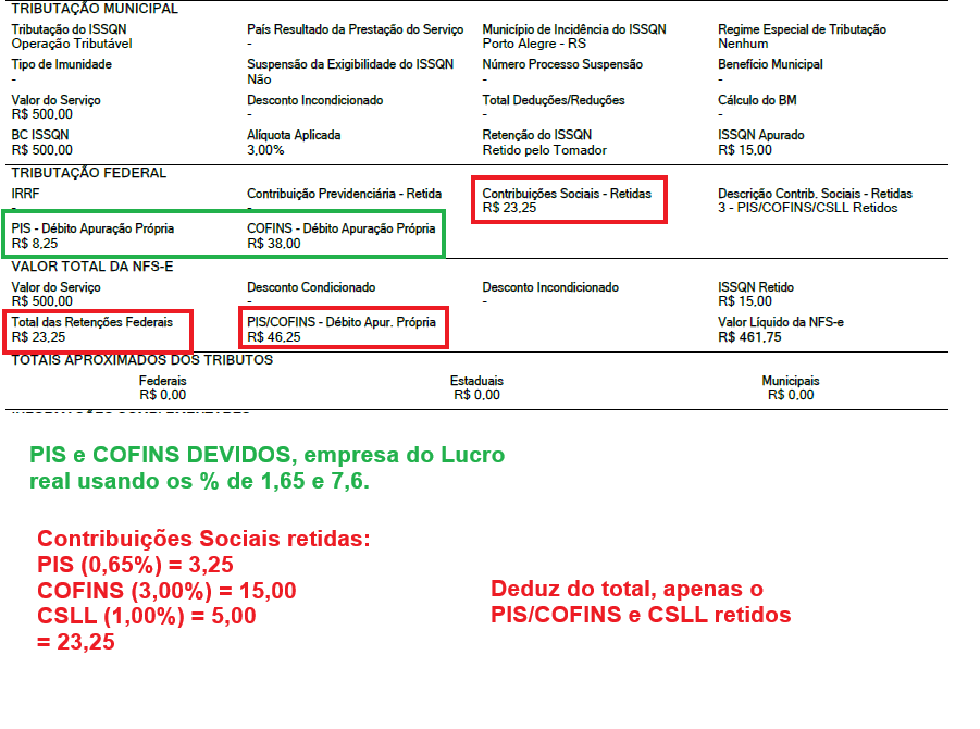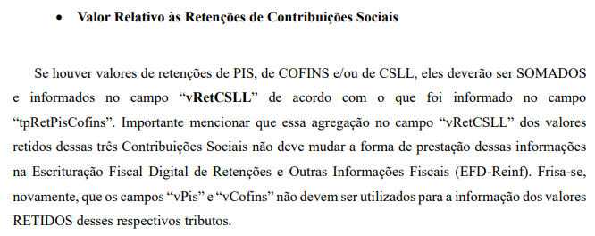 Aqueles campos PIS COFINS que ficam no quadro TRIBUTAÇÃO FEDERAL é o PIS/COFINS devido que eles mencionaram na NT 007 que as empresas estavam se equivocando, ai indicaram para que o PIS/COFINS retido seja somado junto na tag “vRetCSLL”.