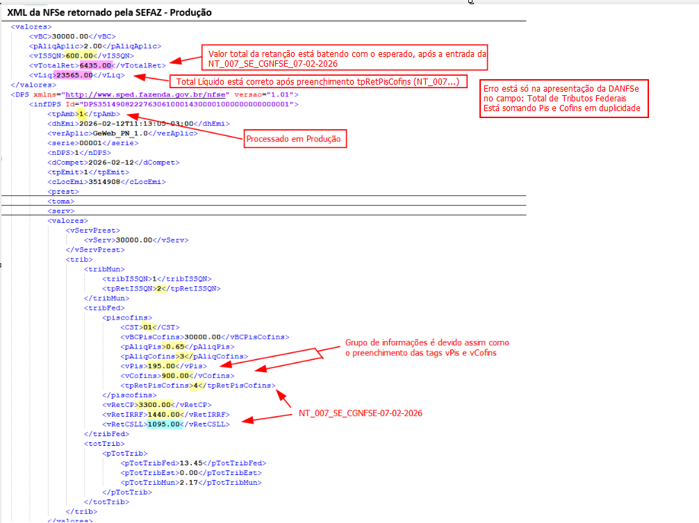 Na magem que postei acima, temos a DANFSe gerada pela SEFAZ em Produção. Nela estão duplicando a dedução de PIS e Cofins, mesmo sendo enviado as informações no XML da DPS tal como novos padrões estabelecidos pela NT_007_SE_CGNFSE_07-02-2026.