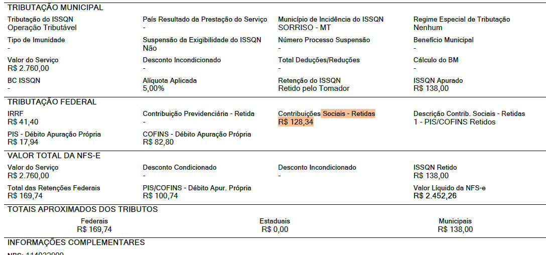 No XML do ambiente nacional, a tag vRetCSLL apresenta o valor de 128,34, sendo que esse mesmo valor também é exibido no PDF gerado pelo portal como “Contribuições Sociais - Retidas”.