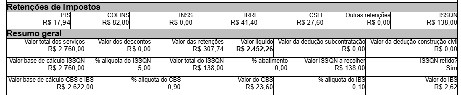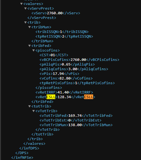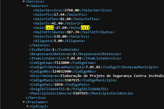 Já no XML da prefeitura o valor da retenção do CSLL seria 27,60. Que tamém, sai no PDF da prefeitura.