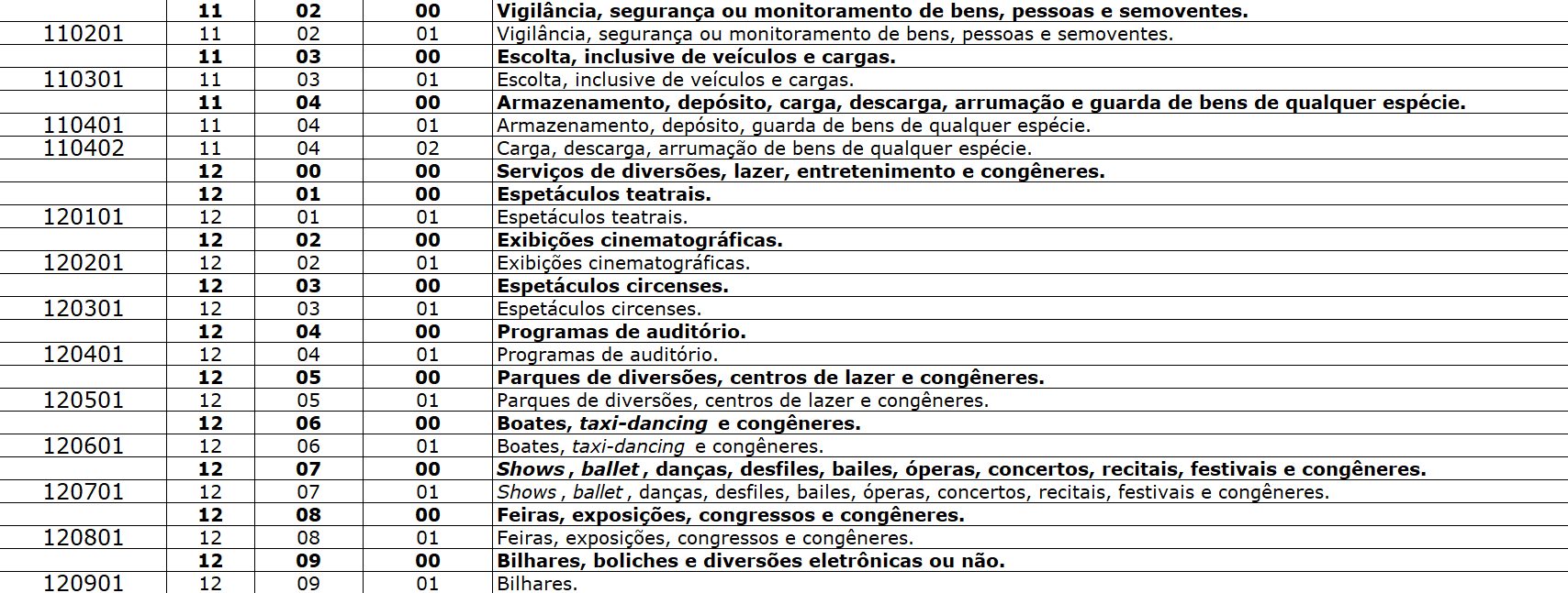 Ao analisarmos o arquivo, notamos que o subitem de serviço 11.05.01 não consta na listagem. No entanto, verificamos que este mesmo código está presente e habilitado tanto no Emissor de Nota Fiscal de Serviço eletrônica (NFS-e) de padrão nacional quanto na configuração da lista de serviços do Painel Administrativo Municipal.