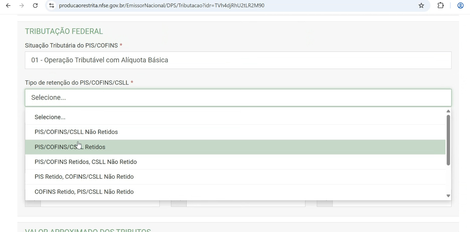 Observei também que antes o ambiente de teste do Portal Nacional (Produção Restrita) haviam 2 opções (retido e não retido), mas agora aparecem opções diversas para retenções de PIS/COFINS/CSLL, tornando confuso quais opções quais valores devem ser enviados.**