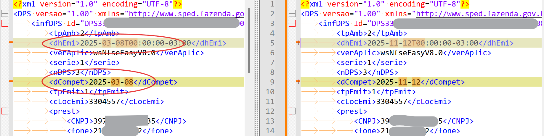 No exemplo abaixo, ao tentar emitir no Rio de Janeiro, a imagem com “dCompet” = 2025-03-08 irá gerar o E0038, a imagem do lado direito, com a data atual do teste (Município ATIVO após esta data), permite gerar o DPS normalmente.