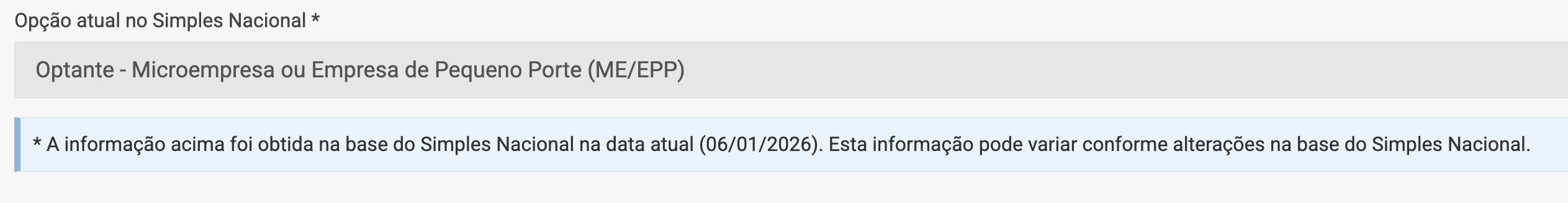 {"sucesso":false,"statusCode":400,"erros":[{"codigo":"E0160","mensagem":null,"descricao":"No mês de competência da NFS-e, a opção de situação perante o Simples Nacional, do prestador, informada na DPS não está de acordo com o cadastro Simples Nacional.","complemento":null}],"idDps":"DPS351620026502578500010049999000000000020659","responseSefinRaw":"{\"tipoAmbiente\":2,\"versaoAplicativo\":\"SefinNacional_1.5.0\",\"dataHoraProcessamento\":\"2026-01-06T14:48:26.9295104-03:00\",\"idDPS\":\"DPS351620026502578500010049999000000000020659\",\"erros\":[{\"Codigo\":\"E0160\",\"Descricao\":\"No mês de competência da NFS-e, a opção de situação perante o Simples Nacional, do prestador, informada na DPS não está de acordo com o cadastro Simples Nacional.\"}]}"}