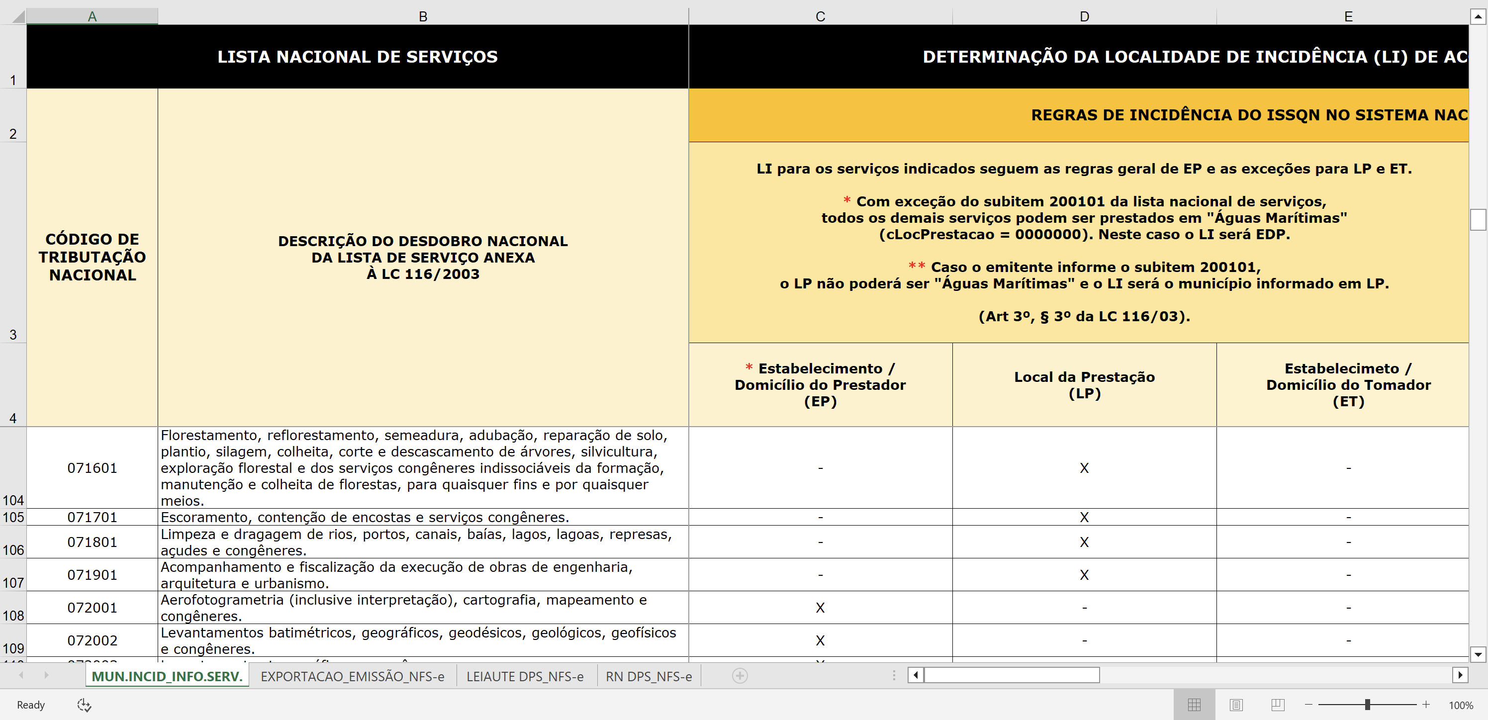 O Anexo I da documentação possui a regra da localidade de incidência do ISSQN de acordo com os itens da LC 116/2003.