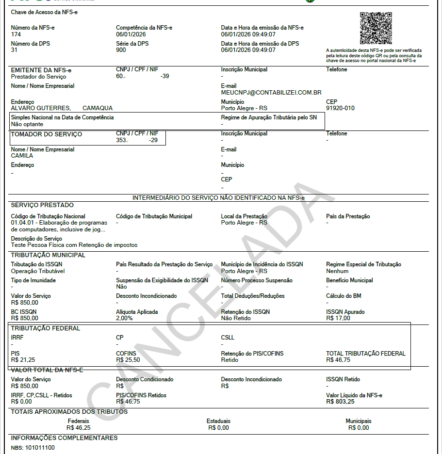 Gostaria de entender se está correto o portal nacional permitir a emissão de uma nota de um prestador do Regime Tributário como Lucro Presumido com Tomador de Serviço como Pessoa Física e ter as retenções dos Impostos Federais (Pis, Cofins, CSLL, IRRF).