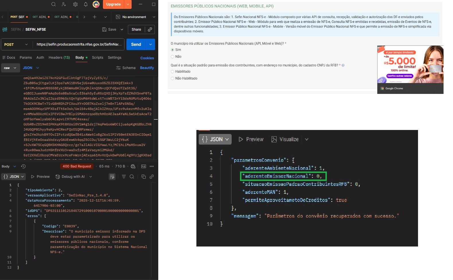 {“tipoAmbiente”:2,“versaoAplicativo”:“SefinNac_Pre_1.4.0”,“dataHoraProcessamento”:“2025-12-11T13:43:52.7429827-03:00”,“idDPS”:“DPS311110121845729100010700001000000000000001”,“erros”:[{“Codigo”:“E0039”,“Descricao”:“O município emissor informado na DPS deve estar parametrizado para utilizar os emissores públicos nacionais, conforme parametrização do município no Sistema Nacional NFS-e.”}]}