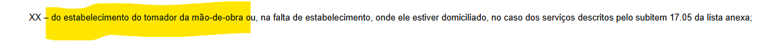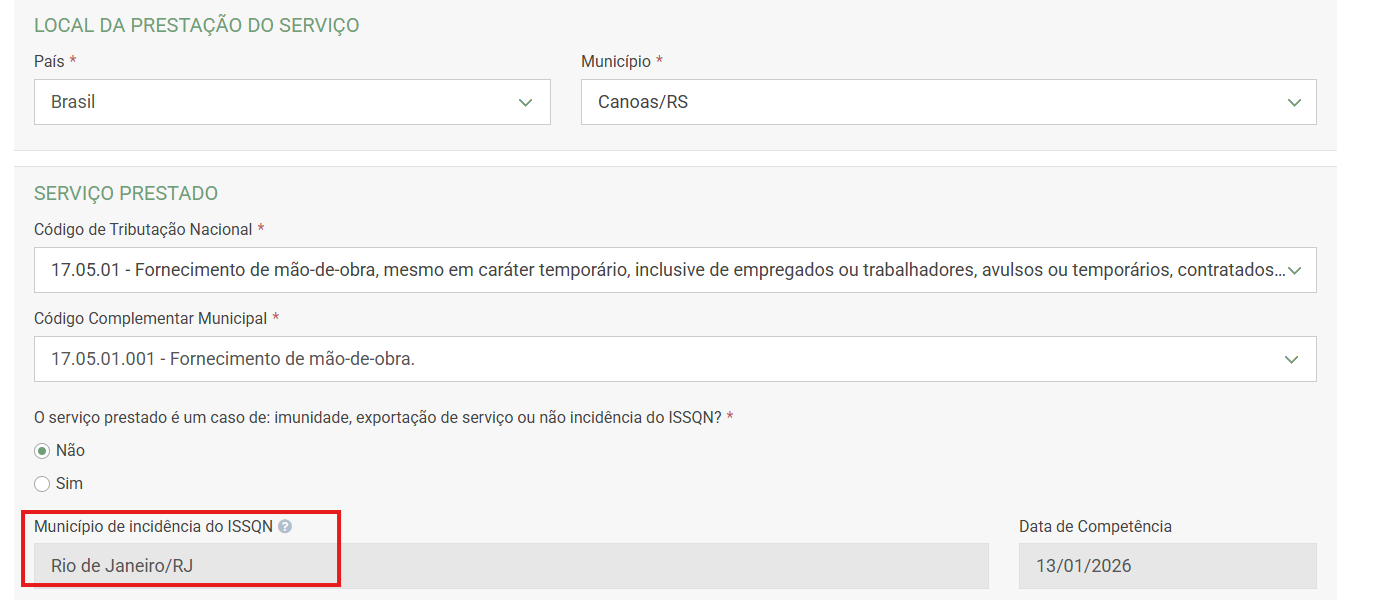 No caso do 17.05, o sistema vai puxar a incidência para o município do Tomador. Se o tomador é de Belford Roxo, a incidência vai para Belford Roxo. Se o tomador for do Rio, vai pro Rio.