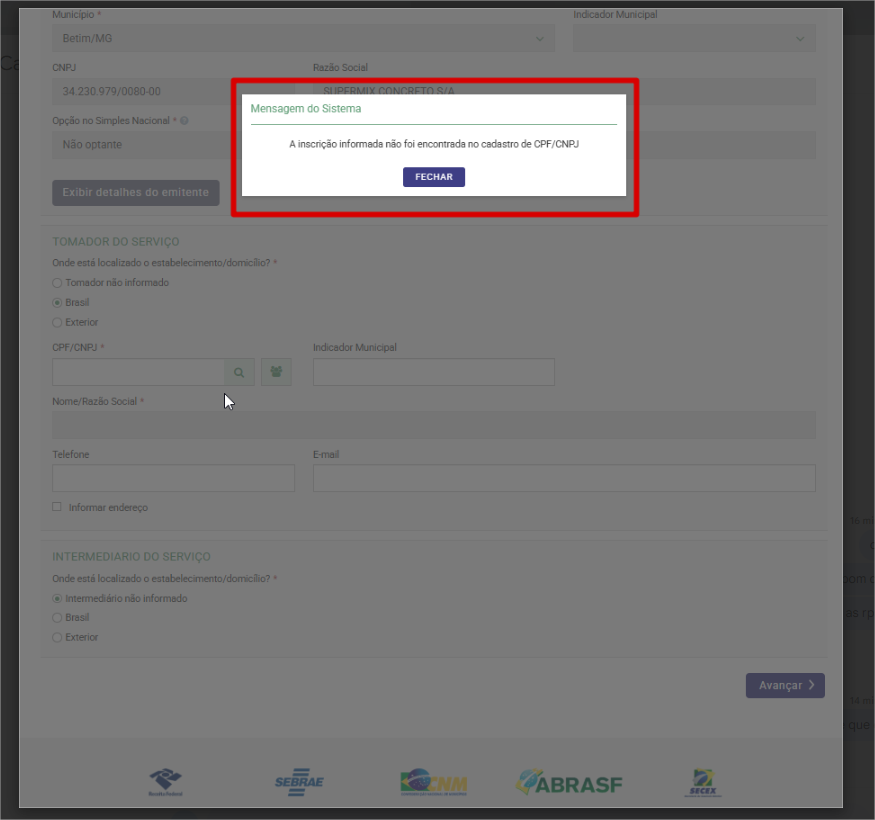 Bom dia, não estamos conseguindo emitir para pessoa física. Está apresentando erro no Portal Nacional (Betim).