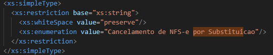 “Complemento”: “The ‘http://www.sped.fazenda.gov.br/nfse:xDesc’ element is invalid - The value ‘Cancelamento de NFS-e por Substituicao’ is invalid according to its datatype ‘String’ - The Enumeration constraint failed.”
