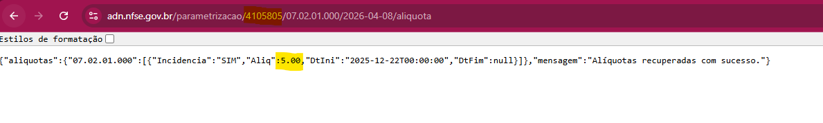 Complementando a explicação do colega, segue print da consulta dos parâmetros do município de Colombo referente ao serviço 7.02: