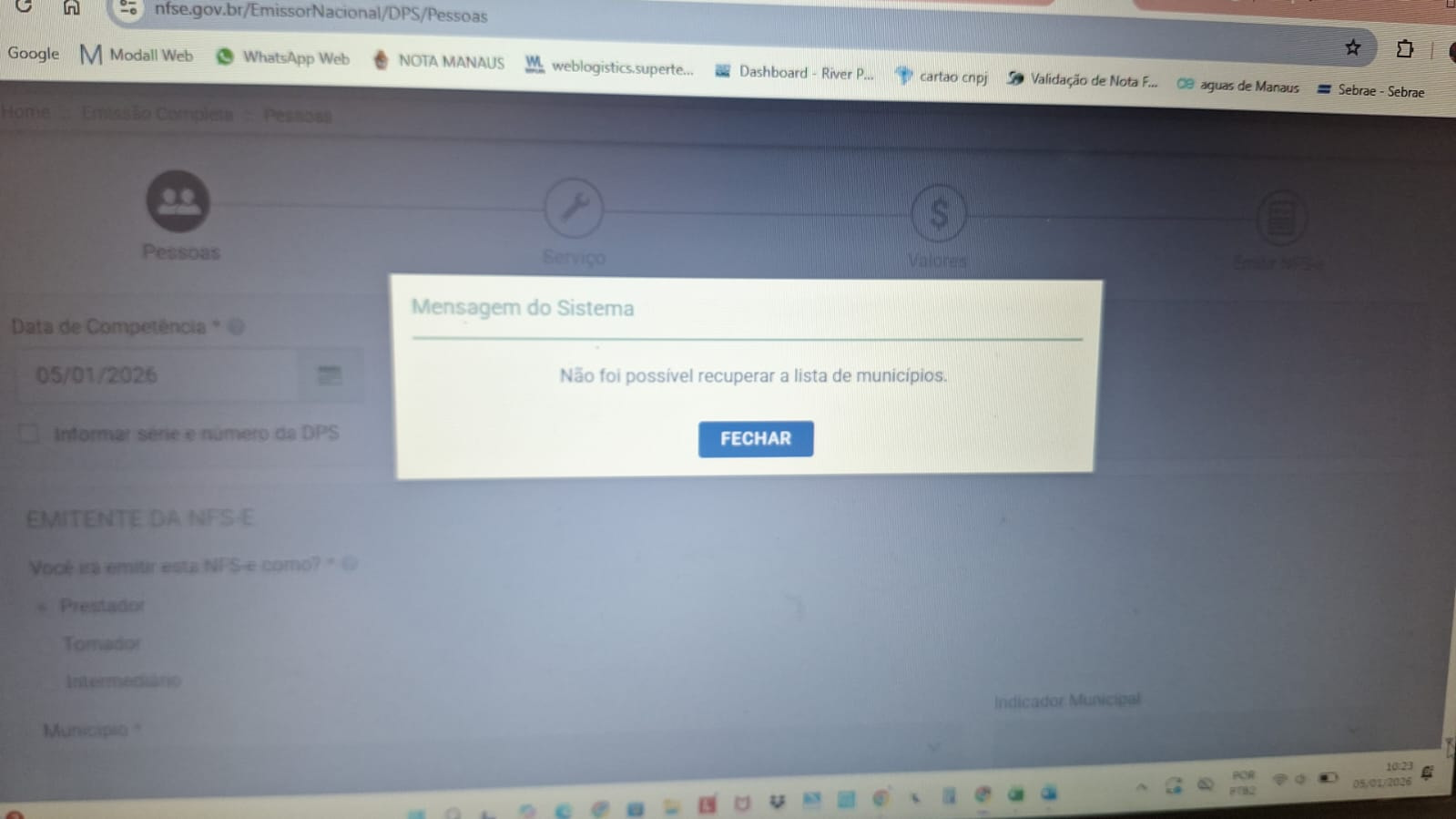 Em Manaus, o erro na emissão da nota fiscal de serviços persiste. Ontem, recebi um retorno do e-mail do ‘Nota Monitoramento’ informando que o sistema estava normalizado; no entanto, consegui emitir apenas uma nota e o problema voltou a ocorrer.