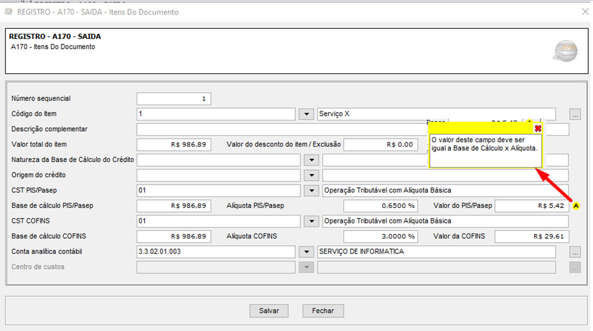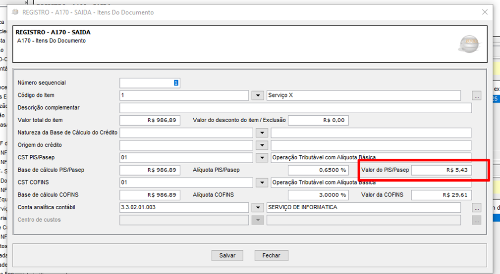 Veja que o valor do PIS foi escriturado com R$ 5,43, que é R$ 0,98 a menos do que o resultado da Base de Cálculo x Alíquota e não aparece advertência\rejeição: